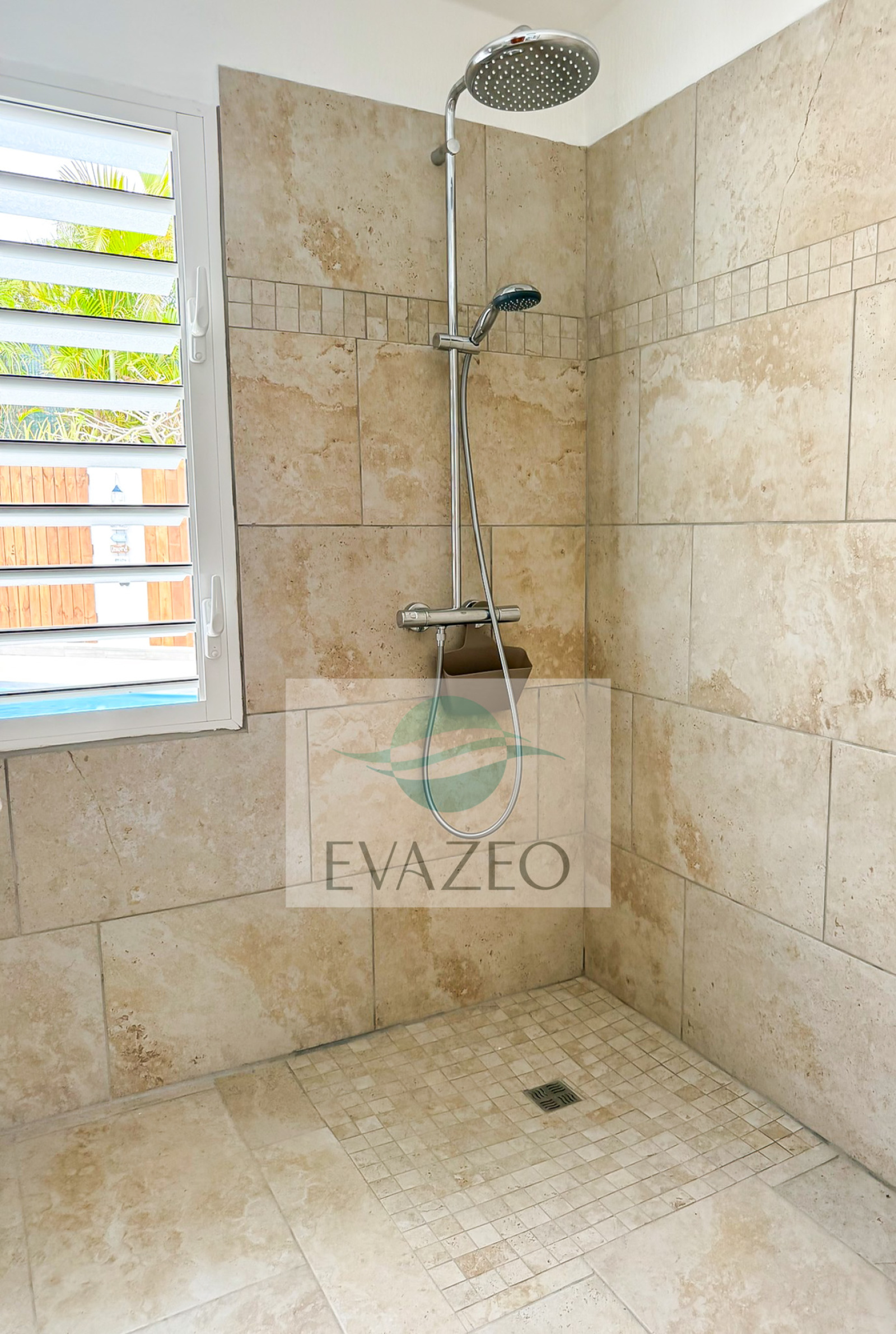- Une salle d'eau en travertin avec douche à l'italienne et WC