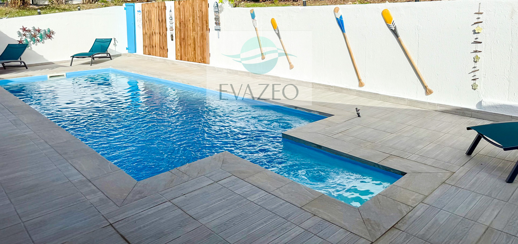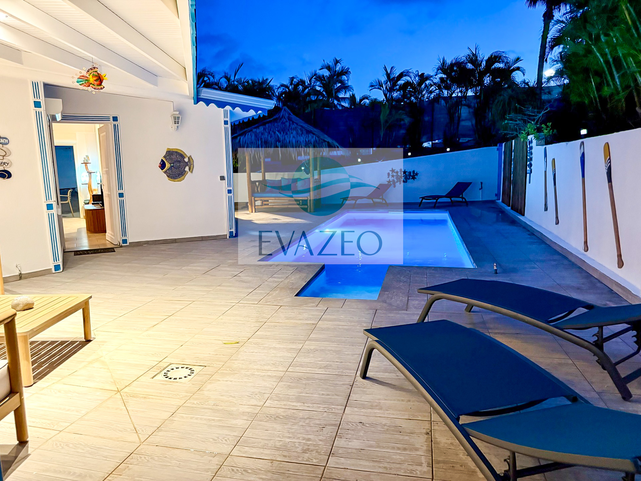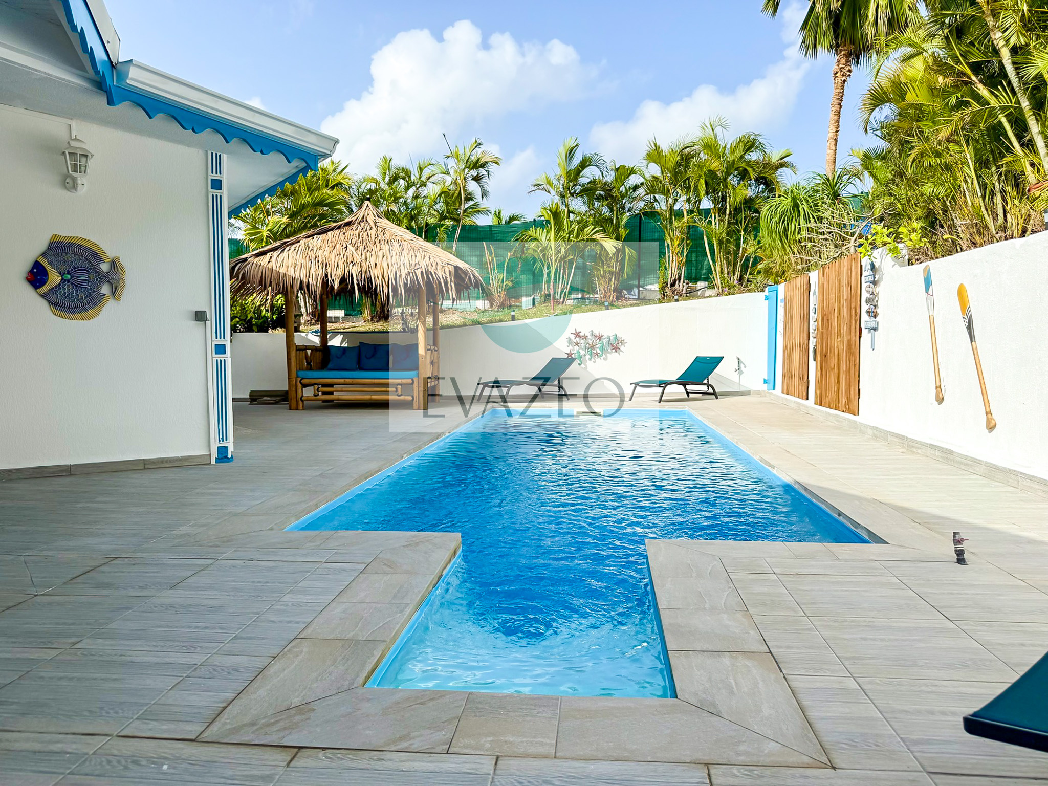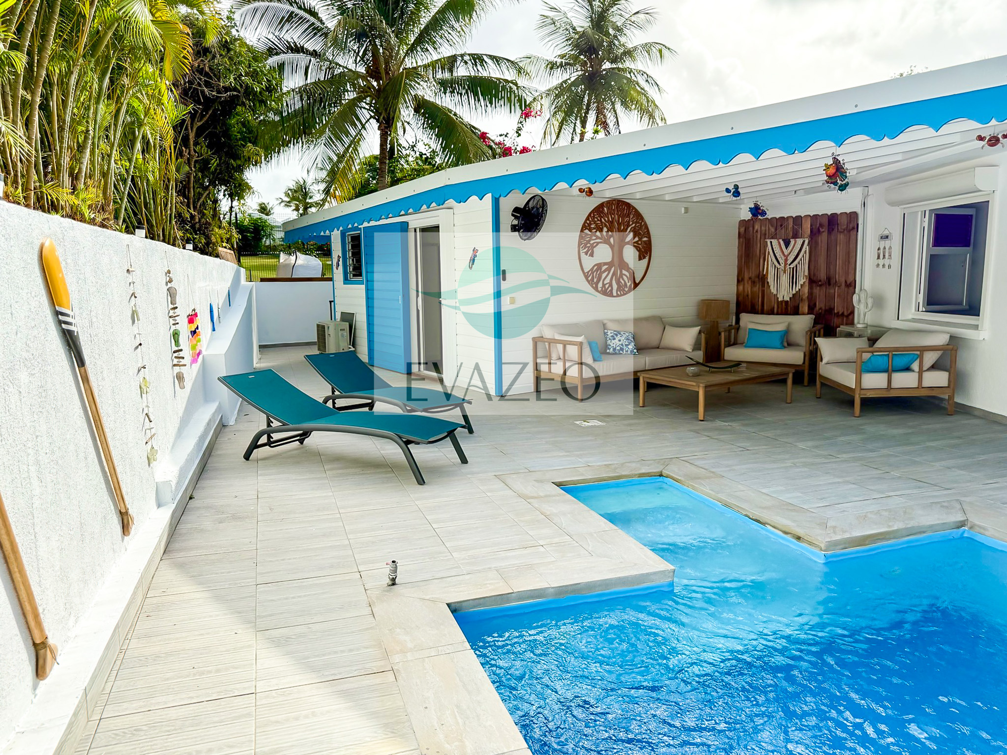- Une seconde terrasse abritée face à la piscine, aménagée en salon extérieur