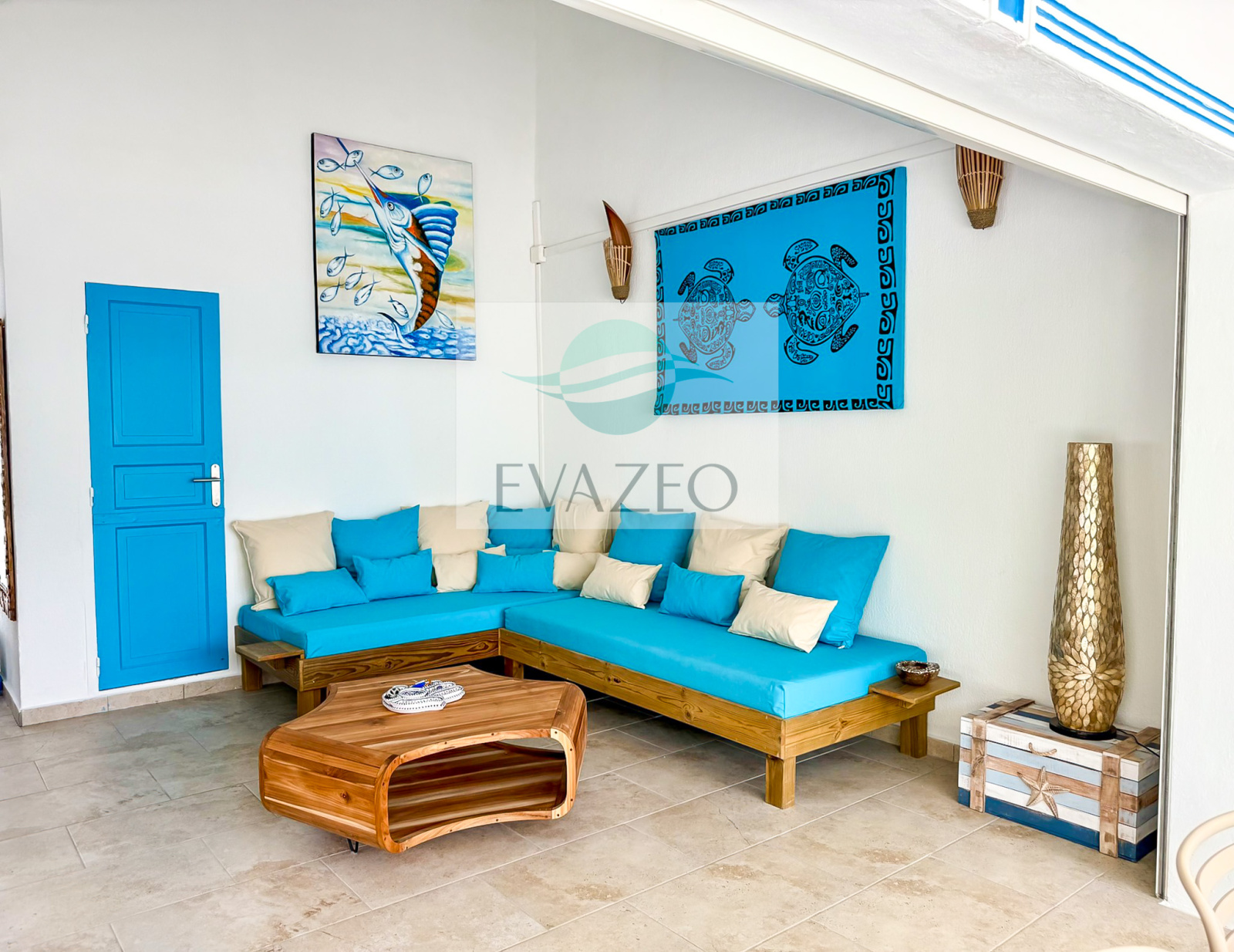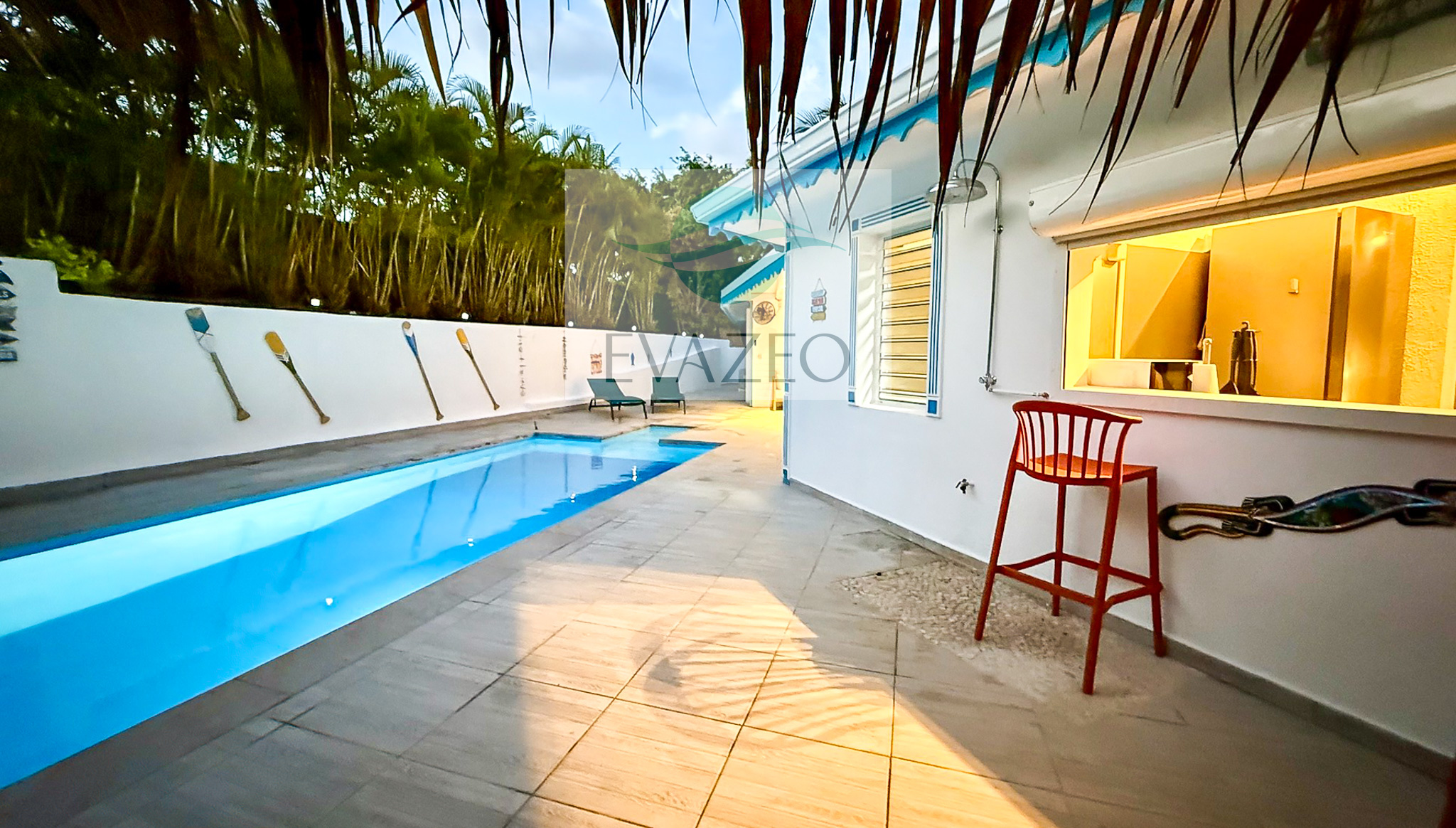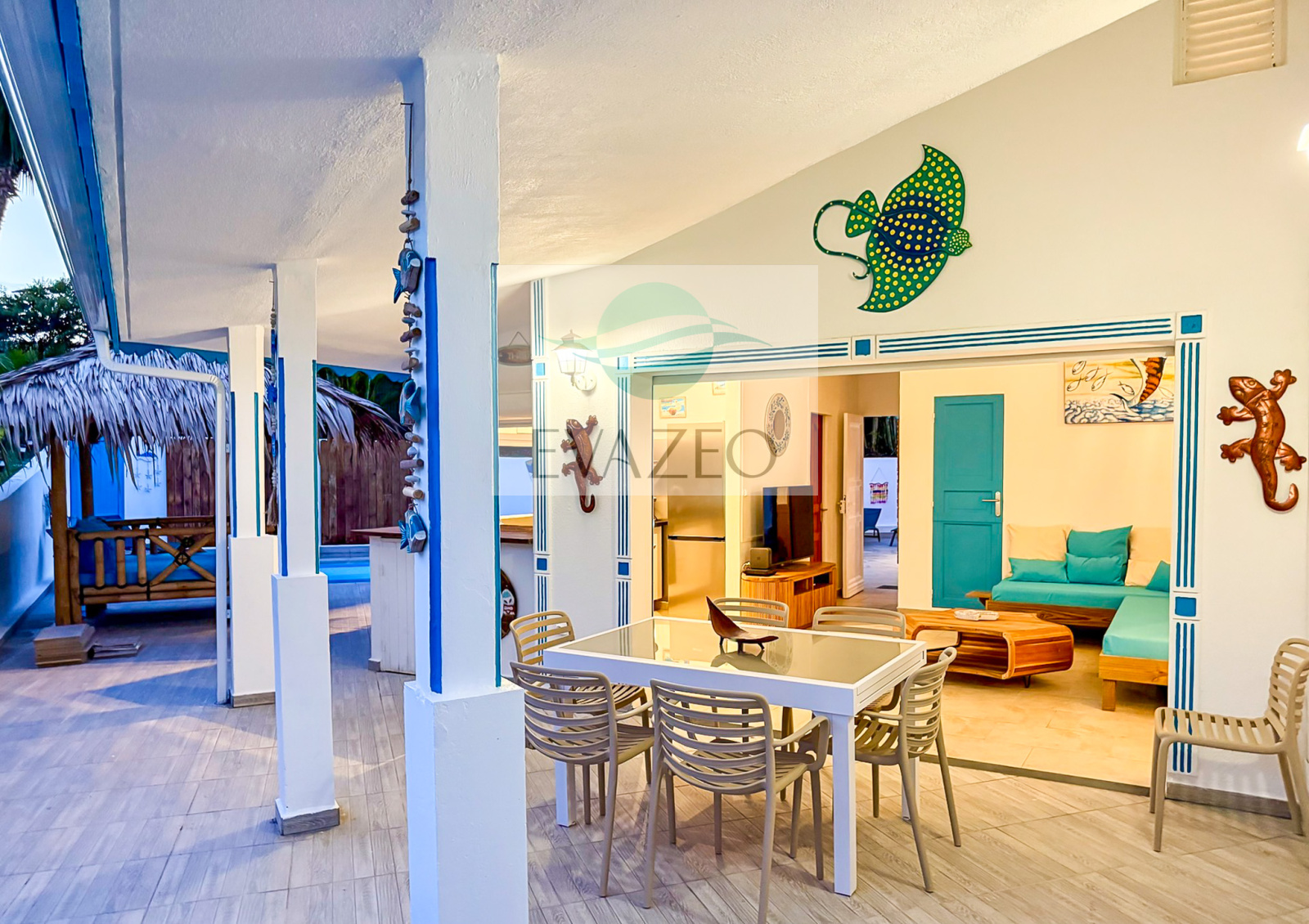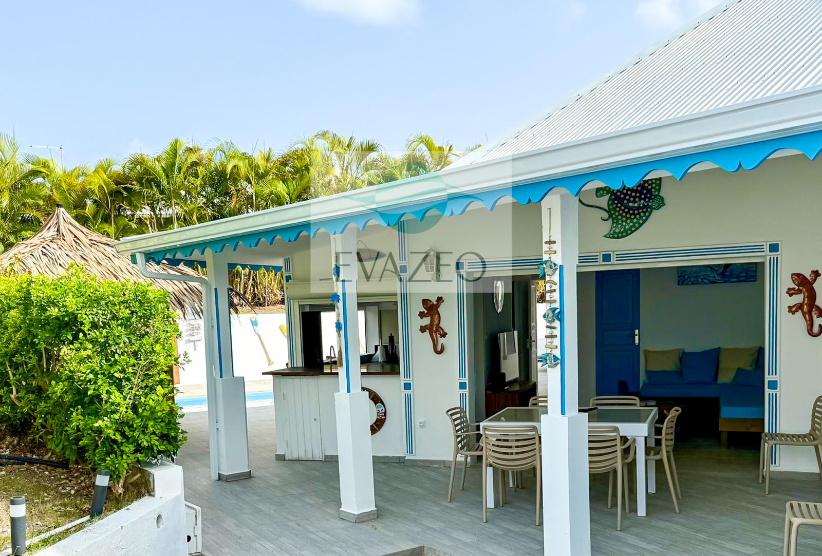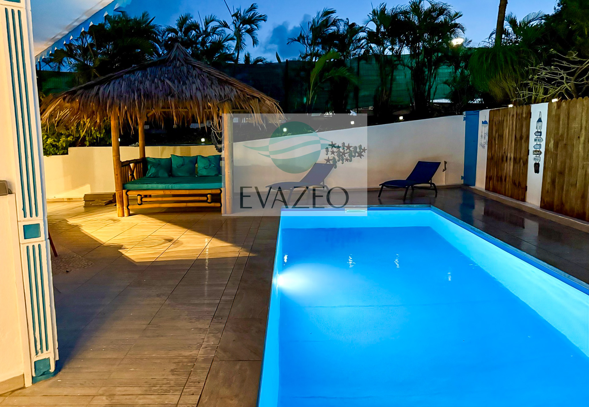 - Une seconde terrasse abritée face à la piscine, aménagée en salon extérieur