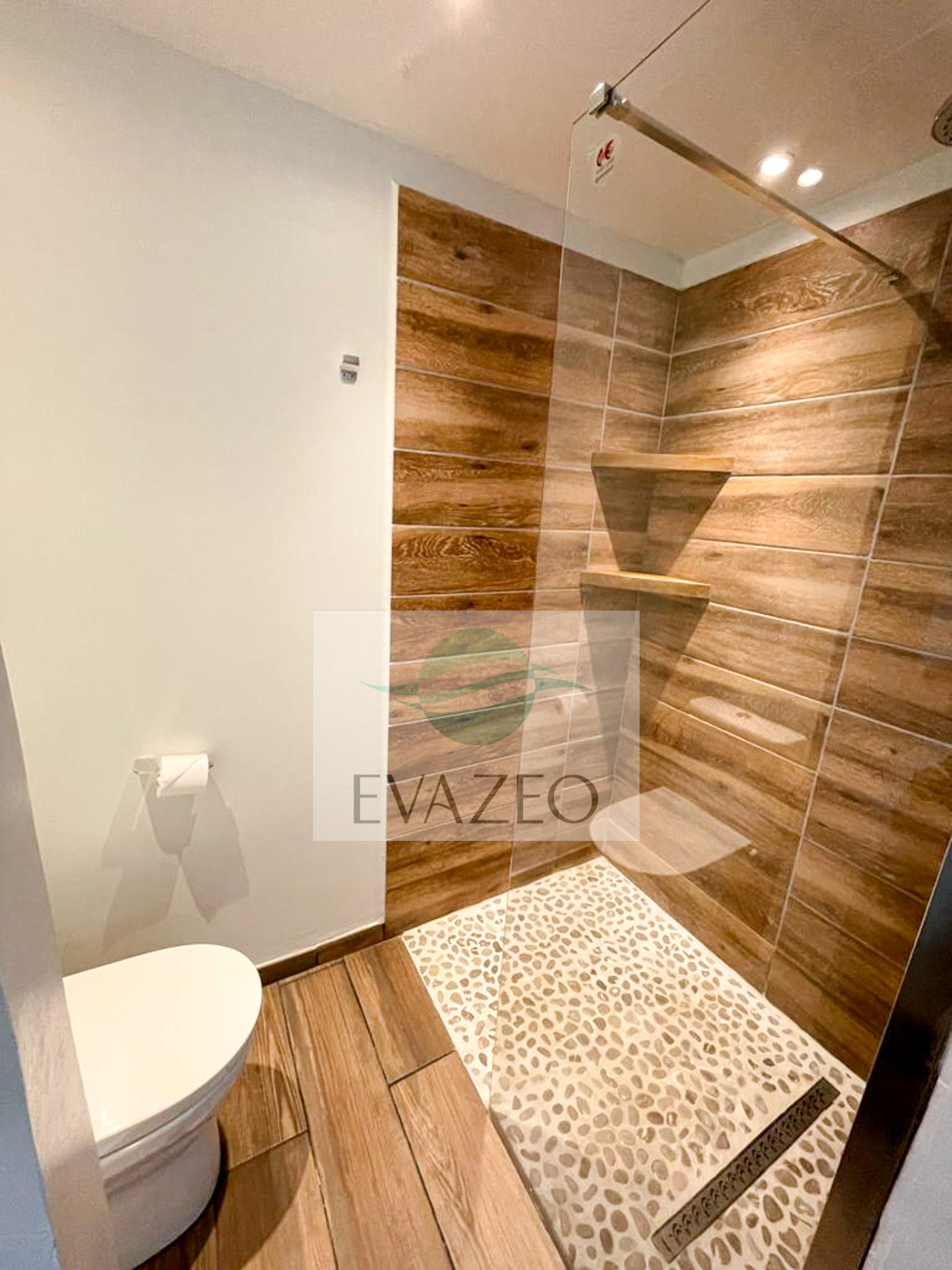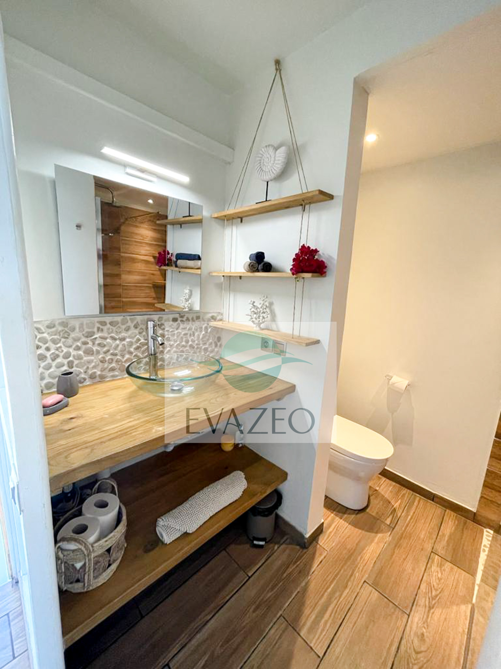 Salle de bain moderne : Grande douche italienne, lavabo, WC, étagères, portants