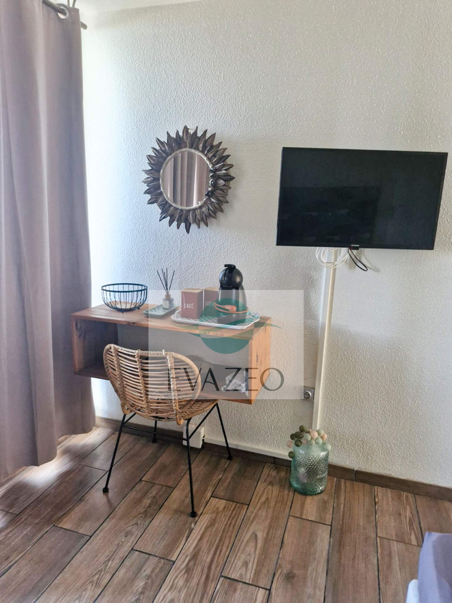 Cuisine équipée : Frigo, micro-ondes, cafetière, plaque électrique, évier, vaisselle complète